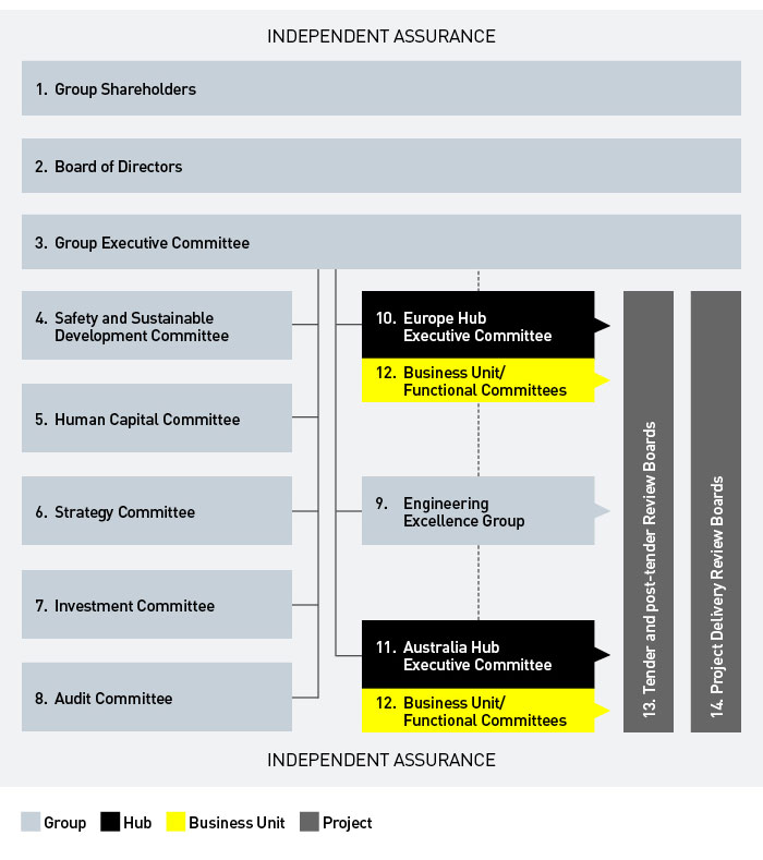 This hub-level executive committee has primary authority for the day-to-day management of business operations across the constituent territories within agreed limits set by the GEC. Members are drawn from senior management in the construction, infrastructure and specialist services businesses and key supporting functions. The committee is also responsible for setting the strategic direction for health, safety and sustainable development activities and monitoring performance.